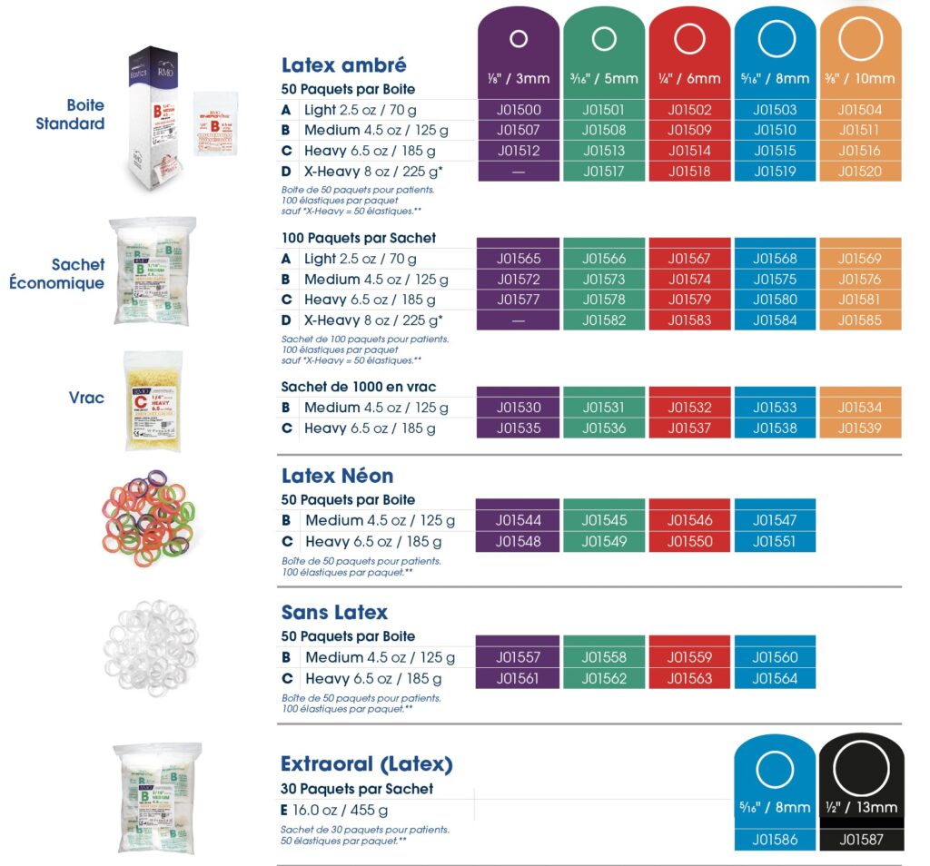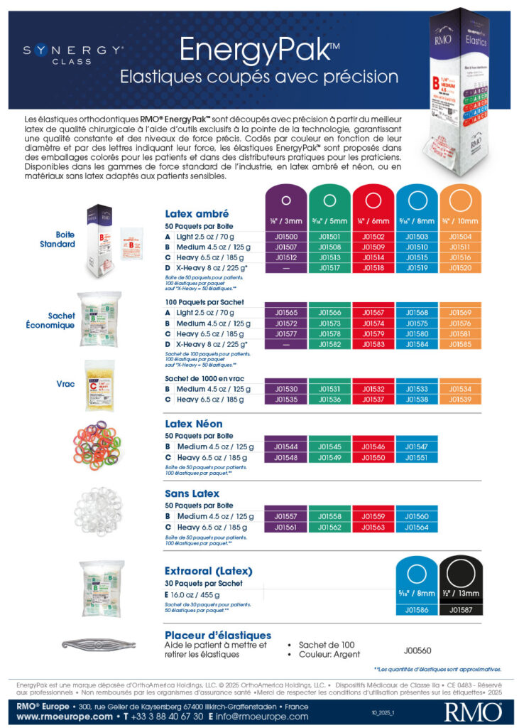 Les élastiques orthodontiques RMO® EnergyPak™ sont découpés avec précision à partir du meilleur latex de qualité chirurgicale à l’aide d’outils exclusifs à la pointe de la technologie. Ils garantissent ainsi une qualité constante et des niveaux de force précis. Codés par couleur en fonction de leur diamètre et par des lettres indiquant leur force, les élastiques EnergyPak™ sont proposés dans des emballages colorés pour les patients et dans des distributeurs pratiques pour les praticiens. Disponibles dans les gammes de force standard de l’industrie, en latex ambré et néon, ou en matériaux sans latex adaptés aux patients sensibles.